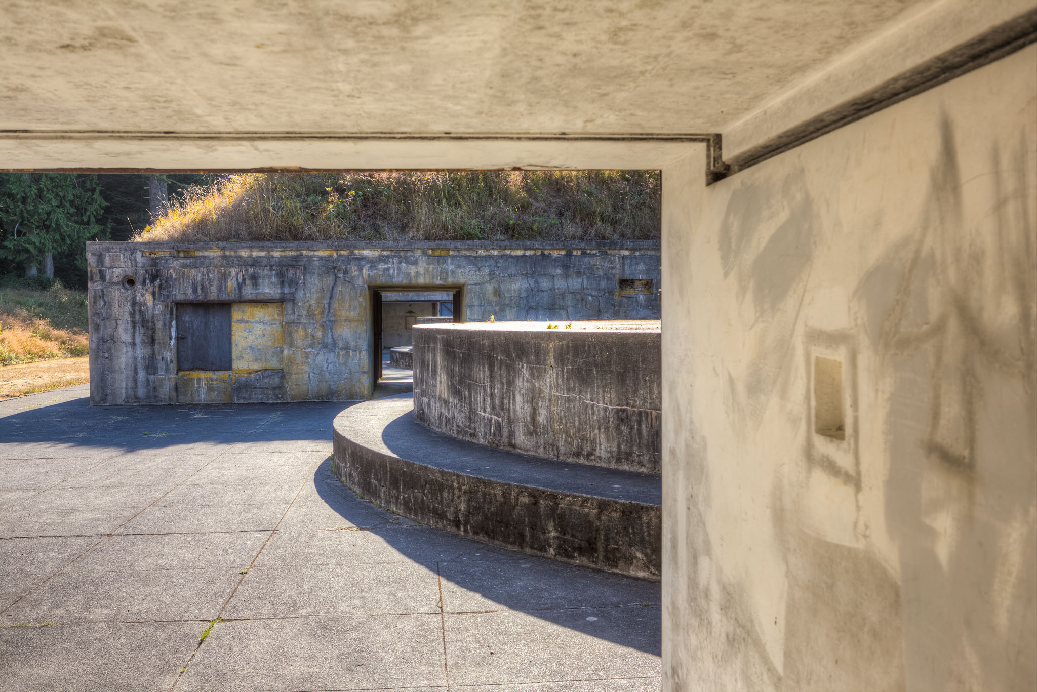 Battery James Calwell. Named for Captain James Calwell, Infantry, commissioned in 1847. Assigned to the Virginia Volunteers, he took part in the early operations of the Mexican War. He was wounded in action at Paso Ovejas. He died September 18, 1847. Battery Calwell construction was started in 1903. Construction was completed in 1964 at a cost of $99,500. The battery mounted four 6 inch disappearing carriage guns. A disappearing carriage gun was lowered to below the lip of the battery for loading. After loading the gun was raised to firing position above the lip. When the gun was fired, the recoil forced the gun back down to the loading position. The only time the gun was visible to the enemy was during firing. The guns were removed in 1918 and shipped to the East Coast where they were mounted of railroad cars and shipped to the European Theater. Gun Weight = 48 Tons Projectile Weight = 108 Pounds Powder Weight = 32 Pounds Range = 7.5 Miles Rate of Fire = 4 rounds per minute Wartime Manning = 5 Officers, 175 Enlisted. Fort Flagler State Park. August 6, 2013.