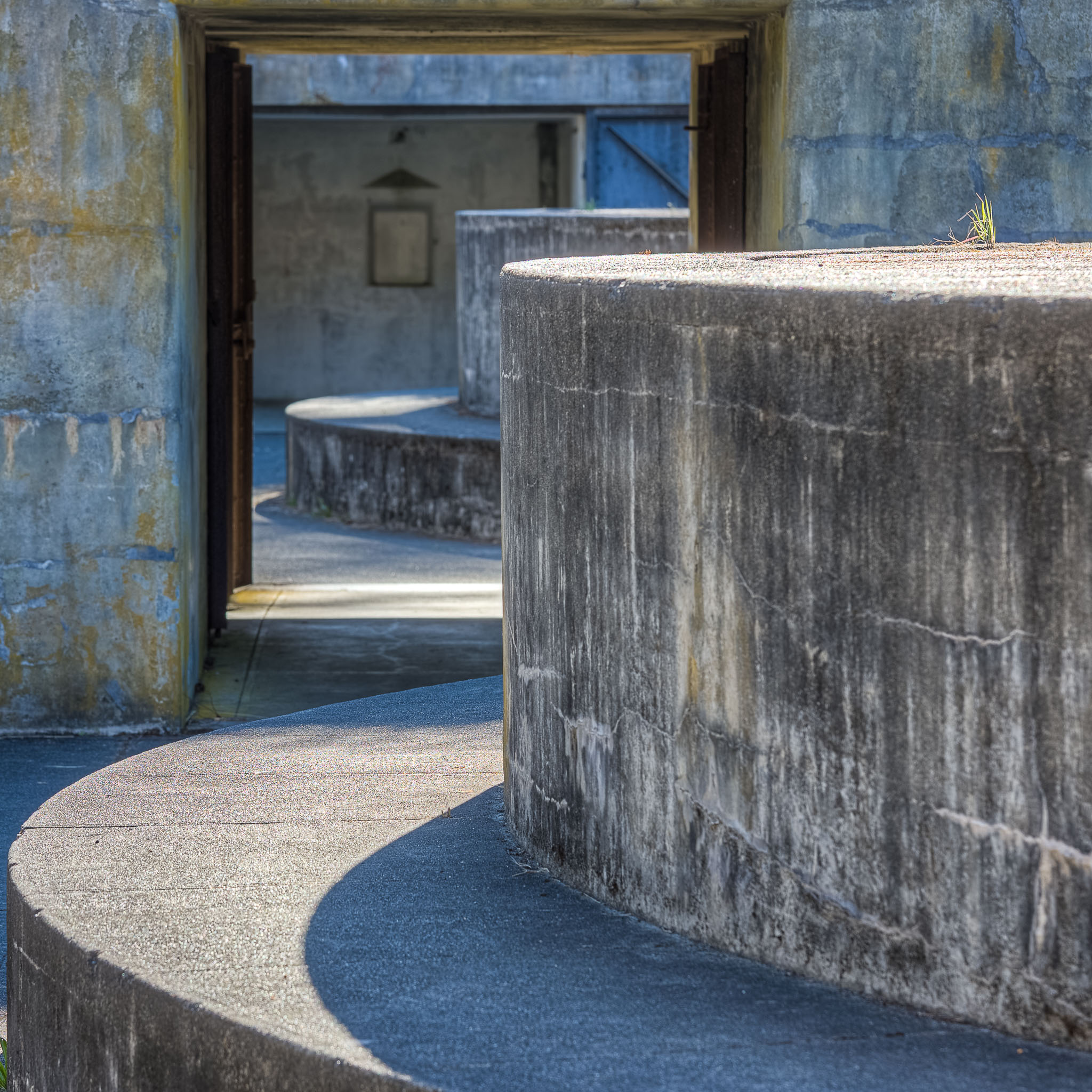 Battery James Calwell. Named for Captain James Calwell, Infantry, commissioned in 1847. Assigned to the Virginia Volunteers, he took part in the early operations of the Mexican War. He was wounded in action at Paso Ovejas. He died September 18, 1847. Battery Calwell construction was started in 1903. Construction was completed in 1964 at a cost of $99,500. The battery mounted four 6 inch disappearing carriage guns. A disappearing carriage gun was lowered to below the lip of the battery for loading. After loading the gun was raised to firing position above the lip. When the gun was fired, the recoil forced the gun back down to the loading position. The only time the gun was visible to the enemy was during firing. The guns were removed in 1918 and shipped to the East Coast where they were mounted of railroad cars and shipped to the European Theater. Gun Weight = 48 Tons Projectile Weight = 108 Pounds Powder Weight = 32 Pounds Range = 7.5 Miles Rate of Fire = 4 rounds per minute Wartime Manning = 5 Officers, 175 Enlisted. Fort Flagler State Park. August 6, 2013.