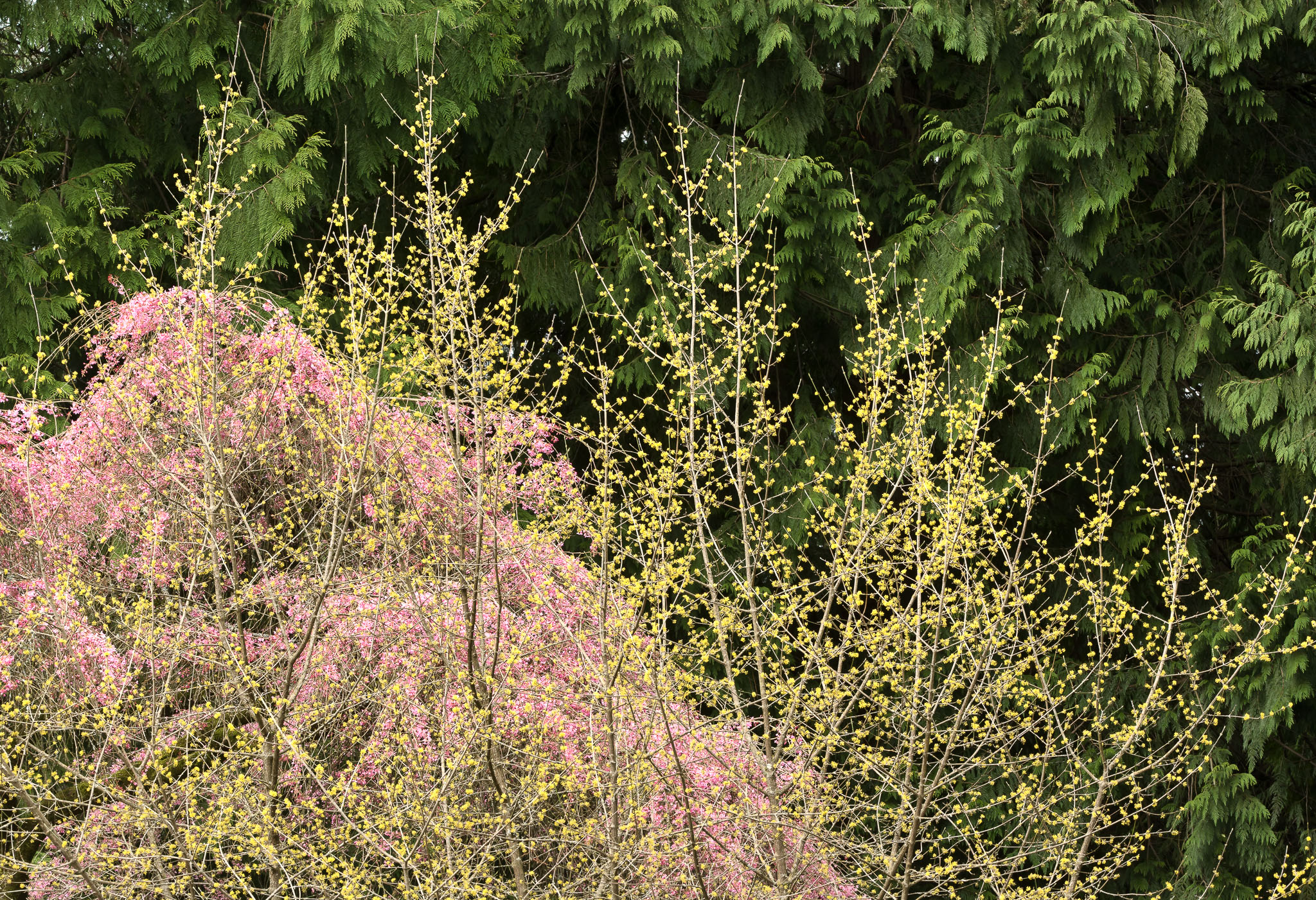 Cormus mas (yellow) and Prunus subhirtella "Pendula' (pink). University of Washington Arboretum