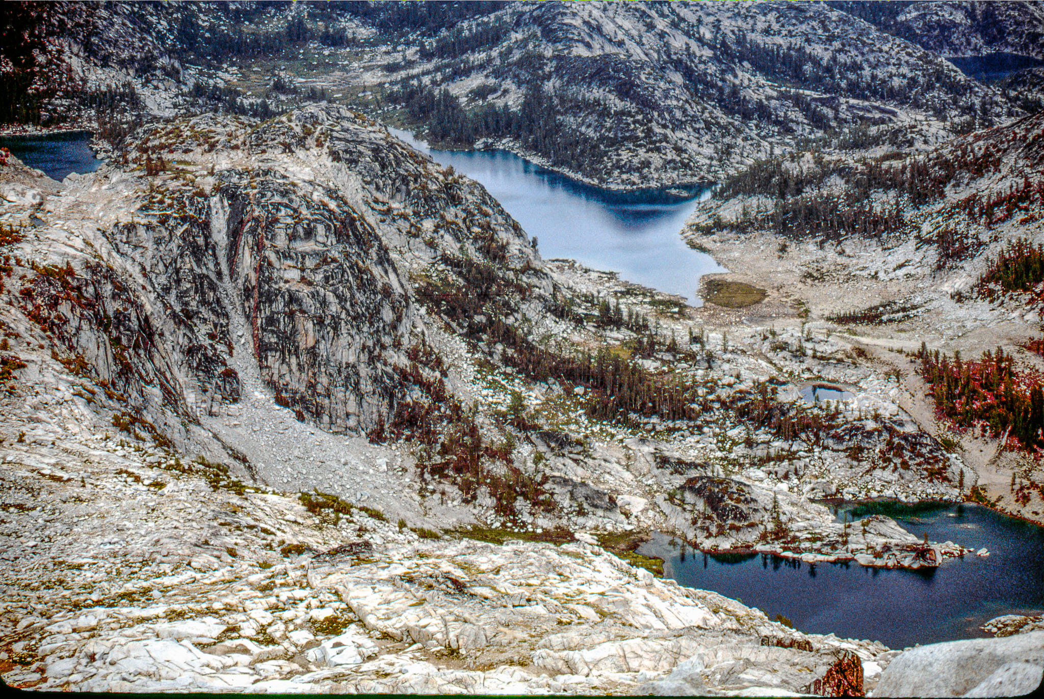 At Little Annapurna above the Upper Enchantment Lakes withj Lower Enchantments Lakes at right in August, 1979, when I was 31.